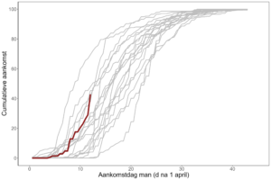 Cumulatieve frequentie van aankomstdatum van mannelijke bonte vliegenvangers van 2007-2026. Ieder lijntje is een jaar, en 2026 is de rode lijn