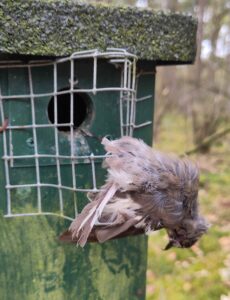 Voor mij is het dus niet altijd feest met de vliegenvangers, maar voor die vliegenvangers is het ook niet altijd feest. Vandaag vond ik een dode man die net uit de nestkast hing. In de nestkast zat een koolmezennest, en ik vrees dat de koolmees de schuldige is. Maar misschien zijn wij als onderzoekers ook wat schuldig: deze vogel leek met zijn teen vast te zitten tussen het hout van de kast en het metalen plaatje dat het nest moet beschermen tegen al te opdringerige spechten. Ik kan me slecht voorstellen hoe een vliegenvanger daarmee vast kan komen te zitten, maar misschien moest hij maken dat hij wegkwam voor de mees, en was dit een noodlottig ongeval.