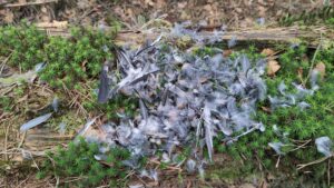 Verder valt het me dit jaar op dat ik vaker dan anders plekresten van vogels vind. Werk van sperwers, terwijl ik toch maar zelden sperwers door het bos zie jagen. Hieronder de resten van een keep. Dat zijn vast mooie boutjes voor een hongerige sperwer: ruim tweemaal zo zwaar als een vliegenvanger, en er schuimen er genoeg door het bos op zoek naar dennenzaden. Laat ze die kepen maar grijpen, en van de (=mijn!) vliegenvangers afblijven. Overigens: die sperwers moeten ook uitkijken. Drie dagen terug vond ik er één die zelf geplukt was. Prooi van een havik (of misschien wel een oehoe).